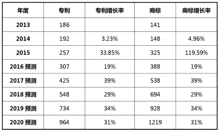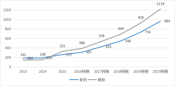 其中,预测专利类案件在2017年将达到425件,到2020年将达到964件;商标类案件在2017年将达到538件,到2020年将达到1219件。参见下表及图: