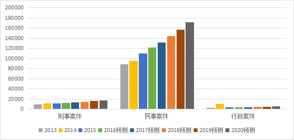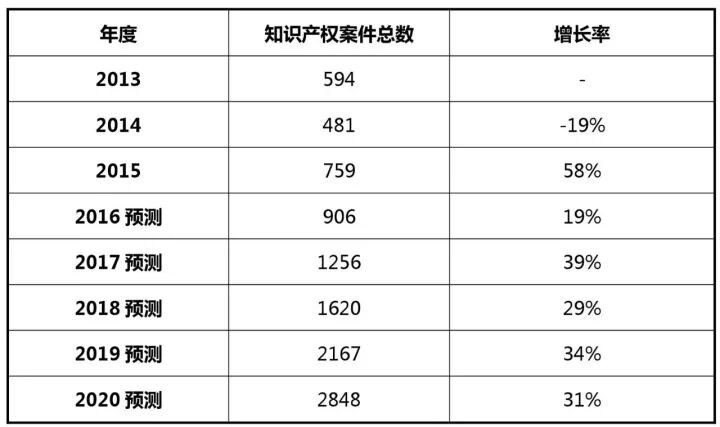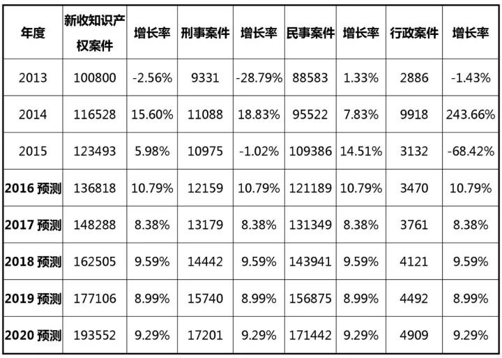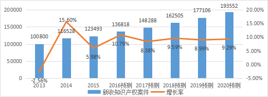 据最高人民法院数据显示[6][7][8],2013年-2015年,全国新收知识产权一审案件从10万件增长到12.34万件,预测2017年将达到14.8万件,增长率8.38%;到2020年,进一步上升到19.3万件,增长率9.29%。参见下表及图: