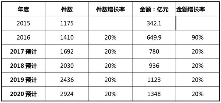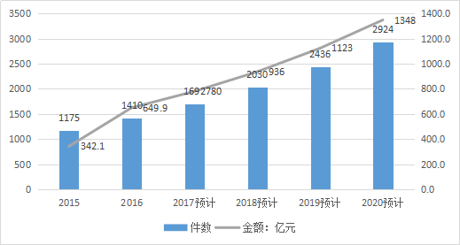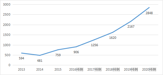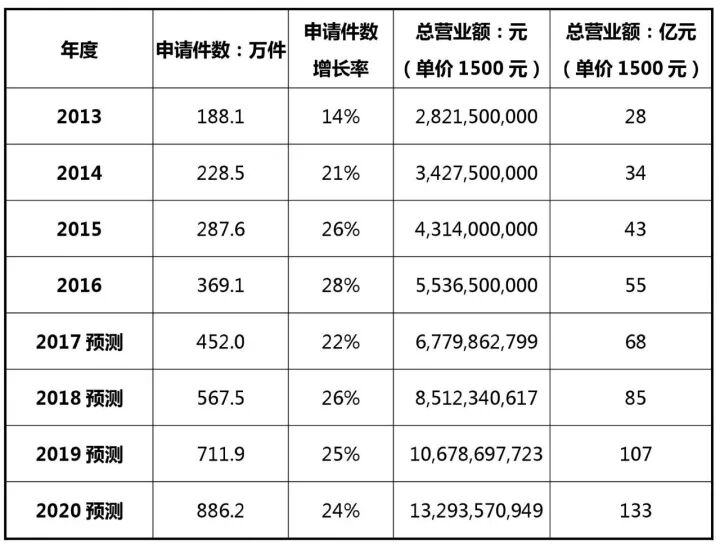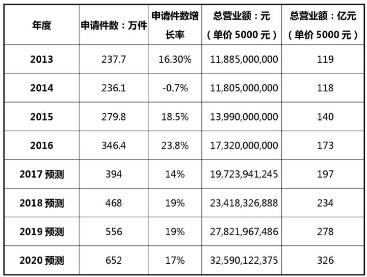 根据知识产权局[4]统计,我国2013-2016年国内外三种专利申请受理量由237.7万件增长到346.4万件,其中,2014年对比2013年不升反降。预计2017年全国的专利申请总量将在394万件,同比增长14%,按国内5家代理机构(柳沈、知果果、超凡、八戒、中细软)平均代理费计算(发明专利9500元,实用新型专利4000元,外观设计专利1500元,即计算平均代理费为5000元),2017年总营业额将达到197亿元;预计2020年全国专利申请总量将在952万件,总营业额将达到326亿元。参见下表及图: