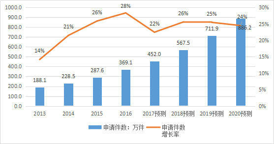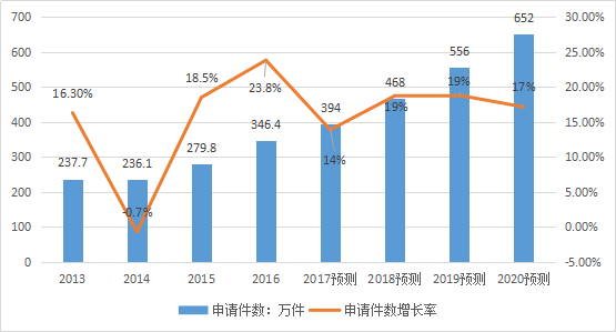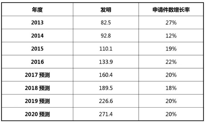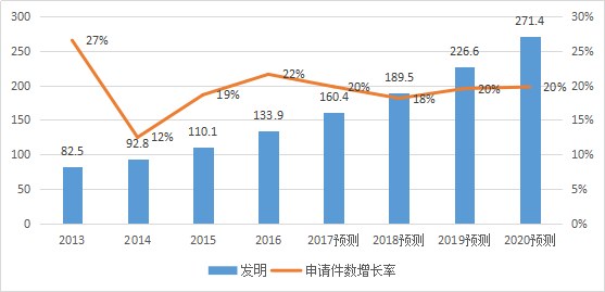 其中[5],2016年,我国共受理发明专利申请133.9万件,同比增长22%,连续6年位居世界首位。预计2017年发明专利申请总量将在160.4万件,同比增长20%;预计2020年全国专利申请总量将在271.4万件,同比增长20%。参见下表及图: