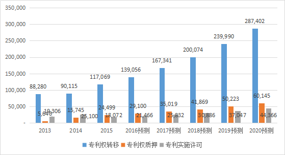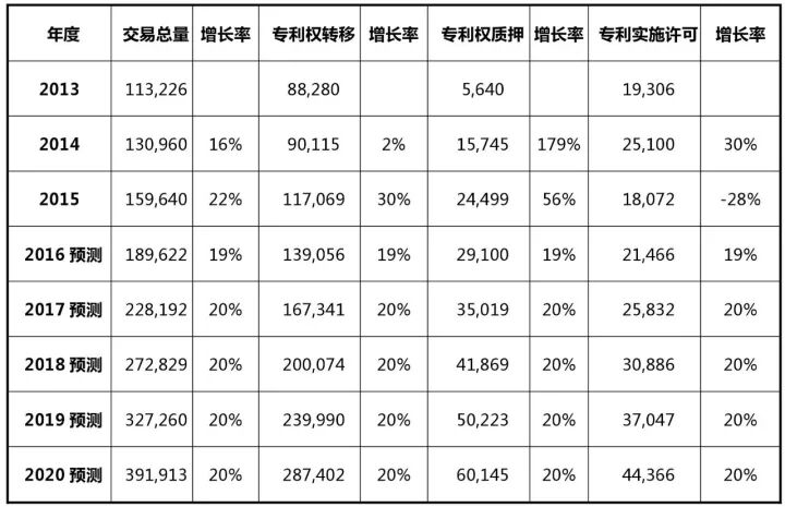 据统计[10][11],2013-2015年,中国专利交易总量从11.3万件跃升至15.9万件,年平均增长率达到19%,预测2017年将达到22万件,增长率为20%;到2020年将达到39万件,增长率为20%。参见下表及图: