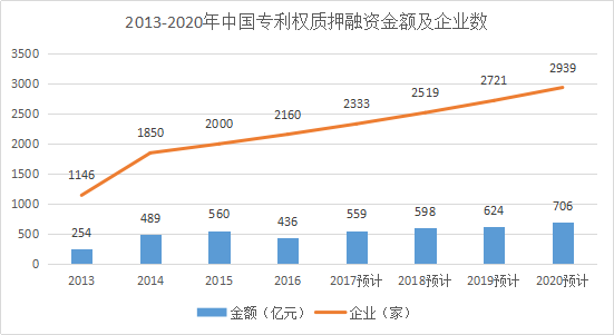 因此,预测2017年全国专利权质押金额累计达559亿元,惠及2333家企业,2020年全国专利权质押金额累计达706亿元,惠及2939家企业,可见我国专利质押融资仍有市场潜力,可予以关注。参见下表及图: